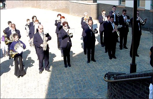 Fanfare "de Eendracht" uit Neer, begeleidt de Communiekantjes naar de St.Martinuskerk, Hemelvaartsdag 24 mei 2001.
